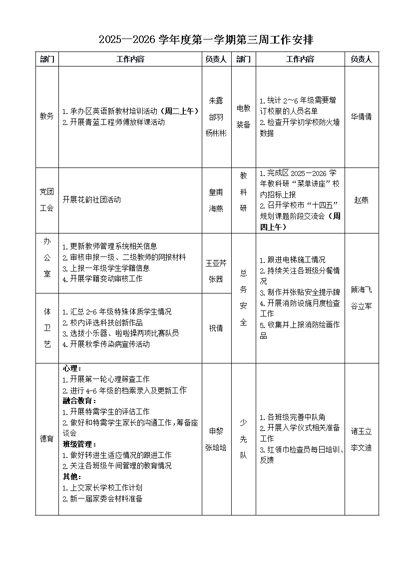 2025—2026学年度第一学期第三周工作安排